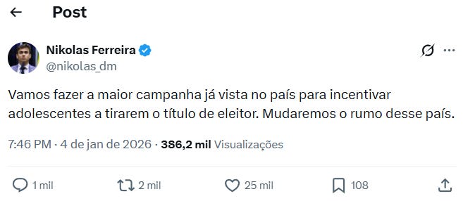 No Brasil, esse fenômeno encontra um terreno particular. Aqui, por enquanto, quem melhor sabe capturar essa energia é a extrema-direita, há anos especializada em se apresentar como força antissistema, mesmo quando ocupa posições centrais de poder. O discurso da ruptura e da rejeição à classe política tradicional funciona como linguagem de identificação para uma juventude que não se sente representada, ainda que essa promessa raramente se traduza em mudanças estruturais reais.